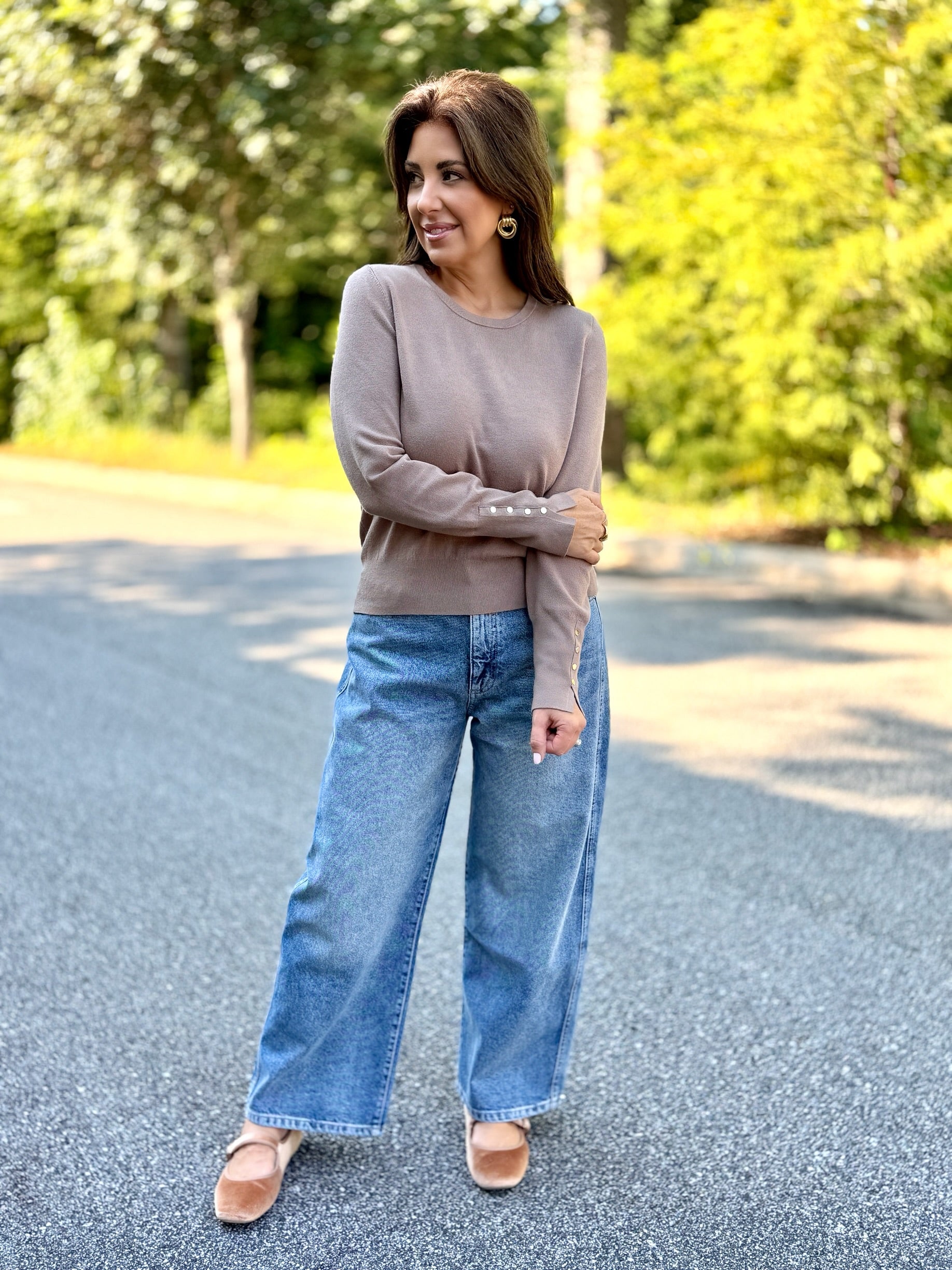 - Solid round neck long sleeve top featuring button detail at cuffs.