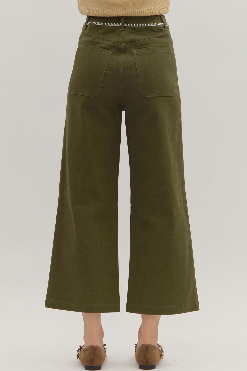 • Solid high waist wide leg pants featuring embroidered blanket stitch trim and front/back patch pockets.
