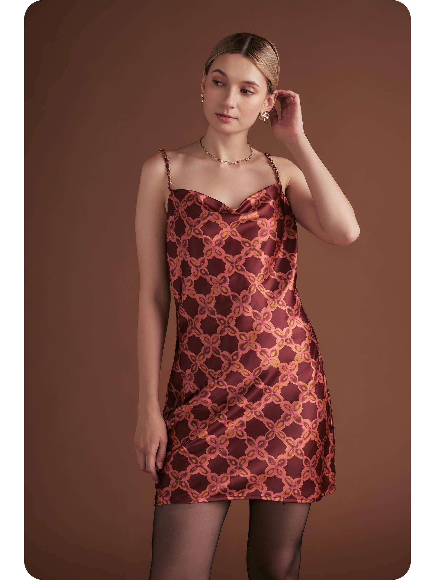 • Burgundy print mini dress with cowl neckline
