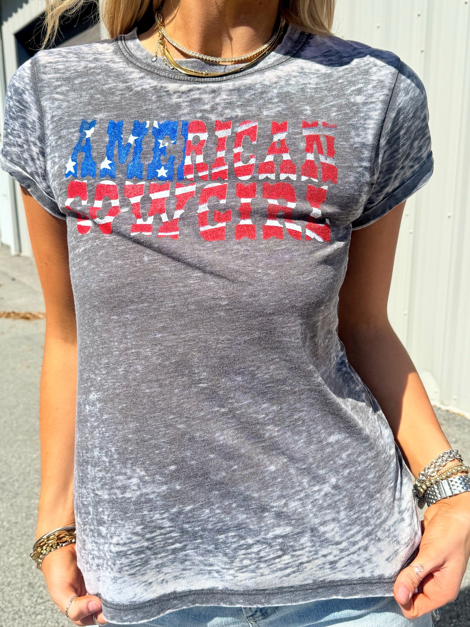 - States "American Cowgirl" across the front in red, white and blue