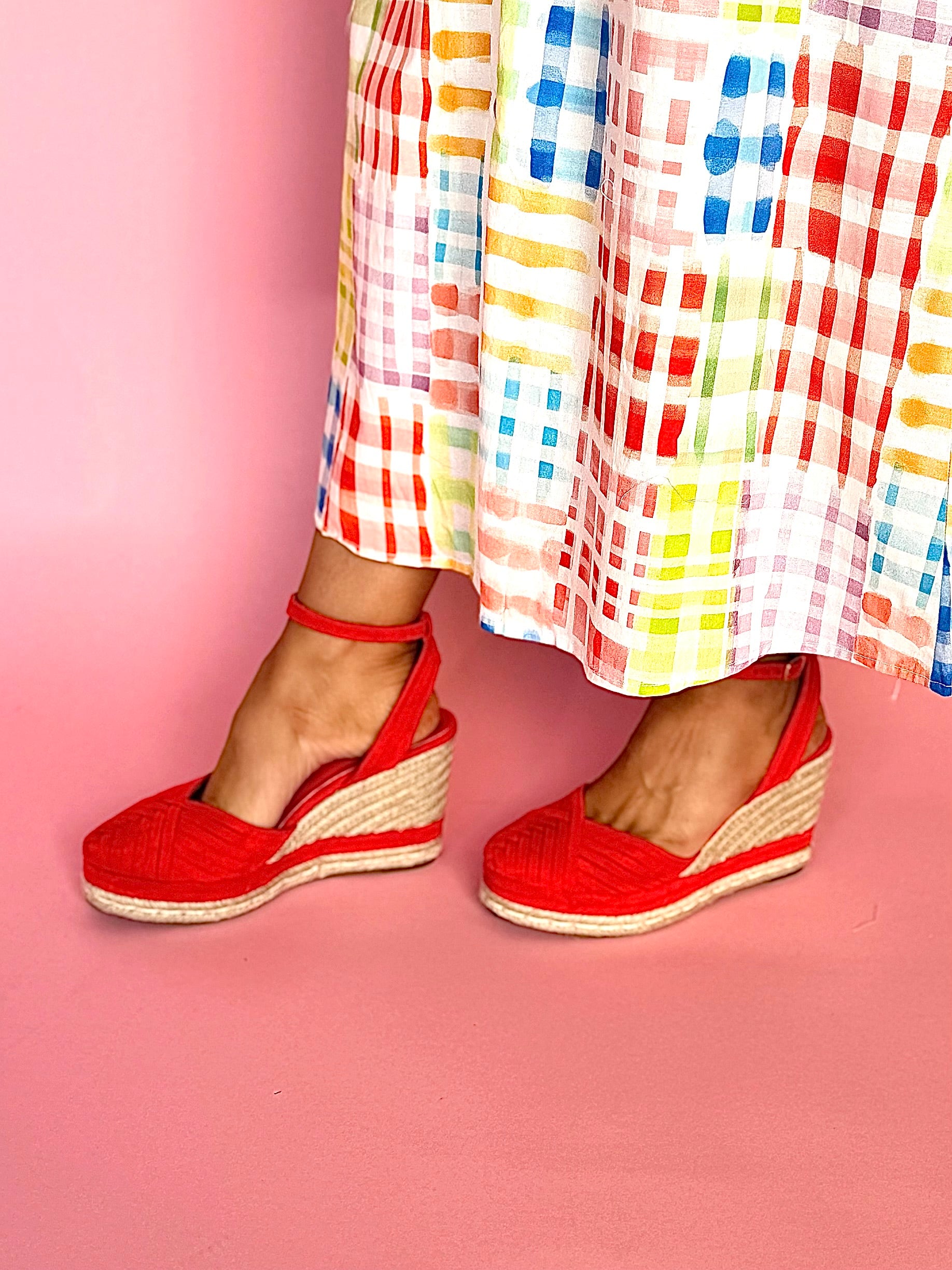 - Red espadrille wedge sandals