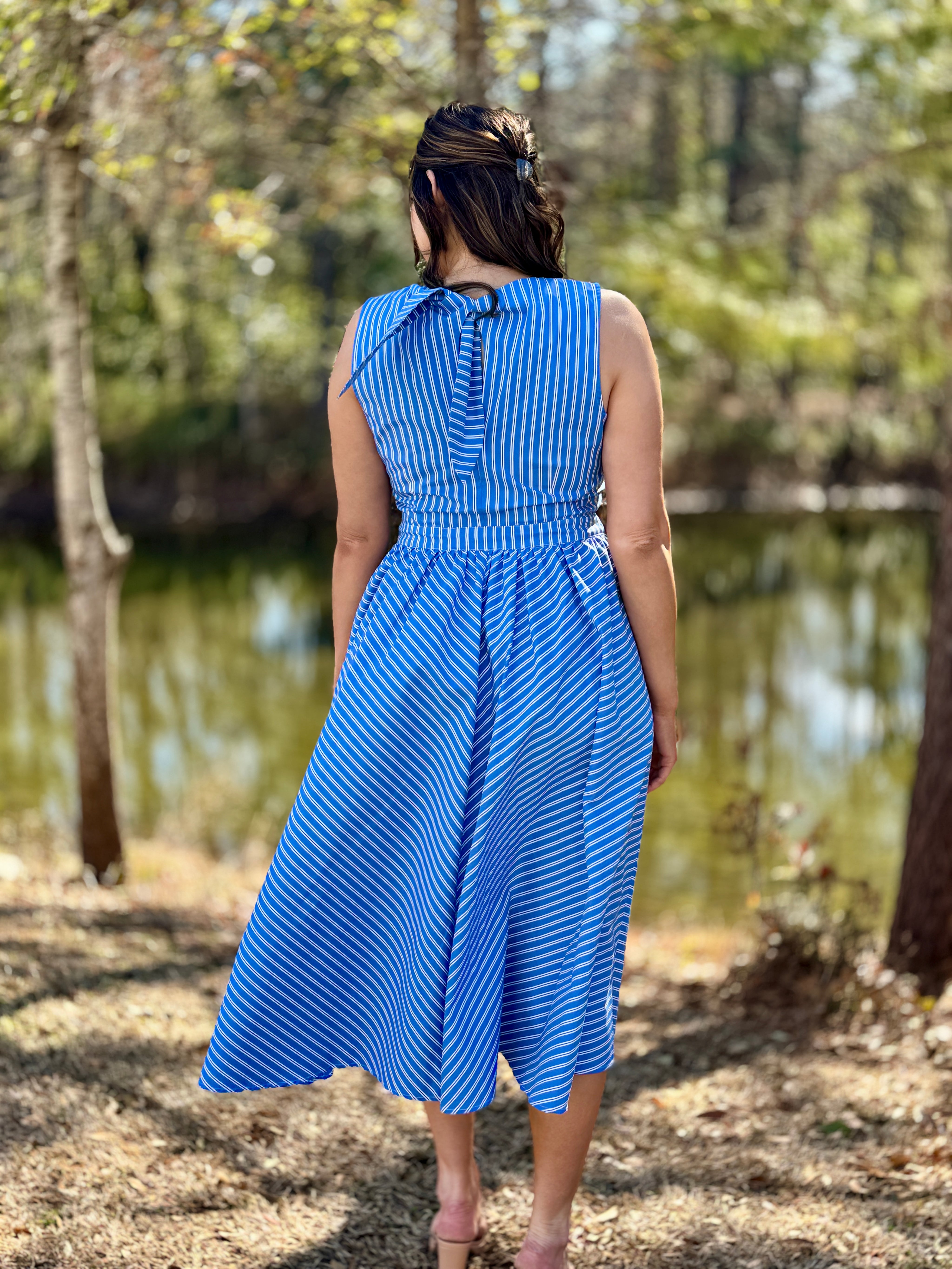 - Poplin Long Stripe Dress with neck tie detail at back