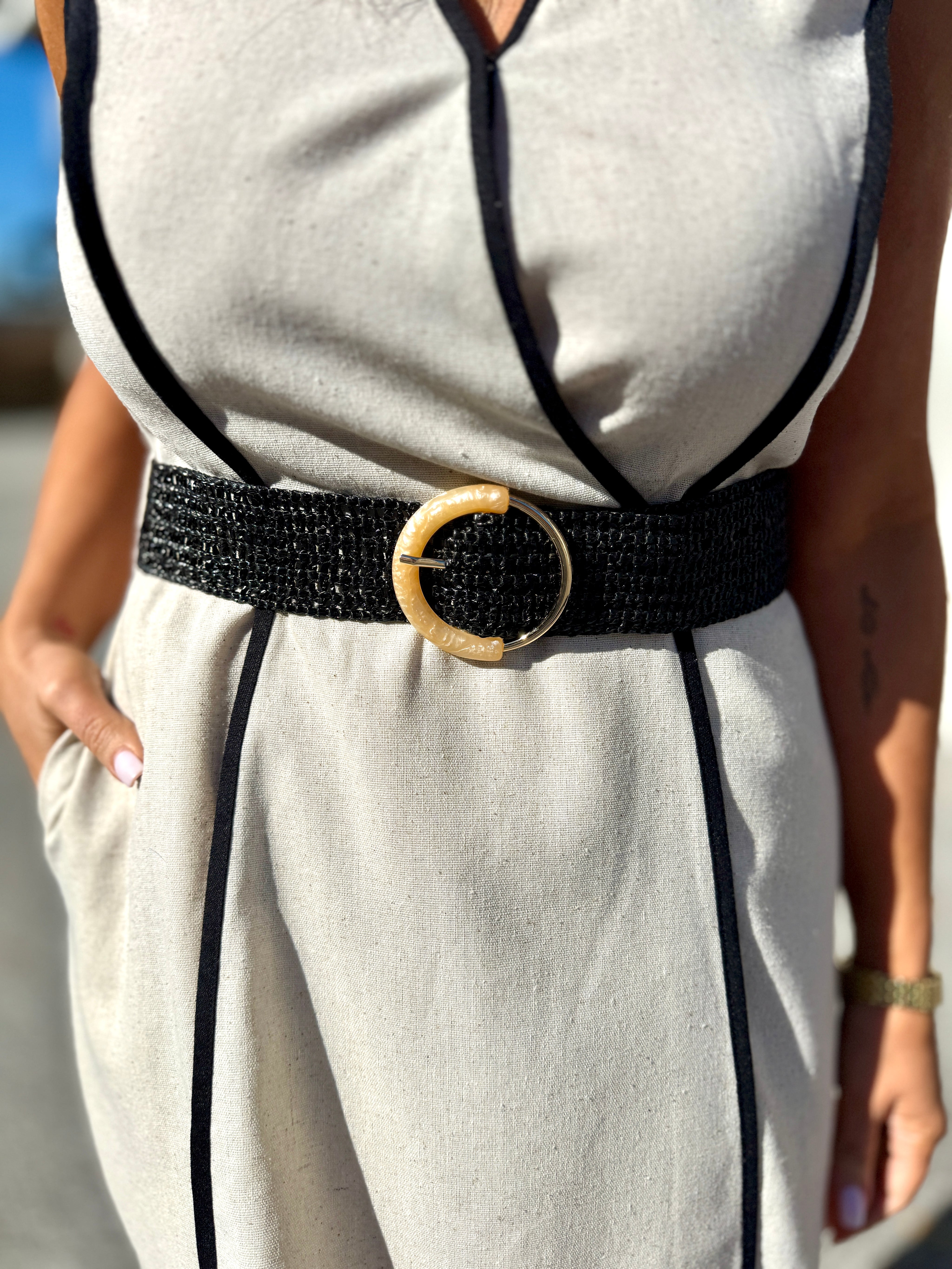 - Adjustable black belt with shell accent at buckle