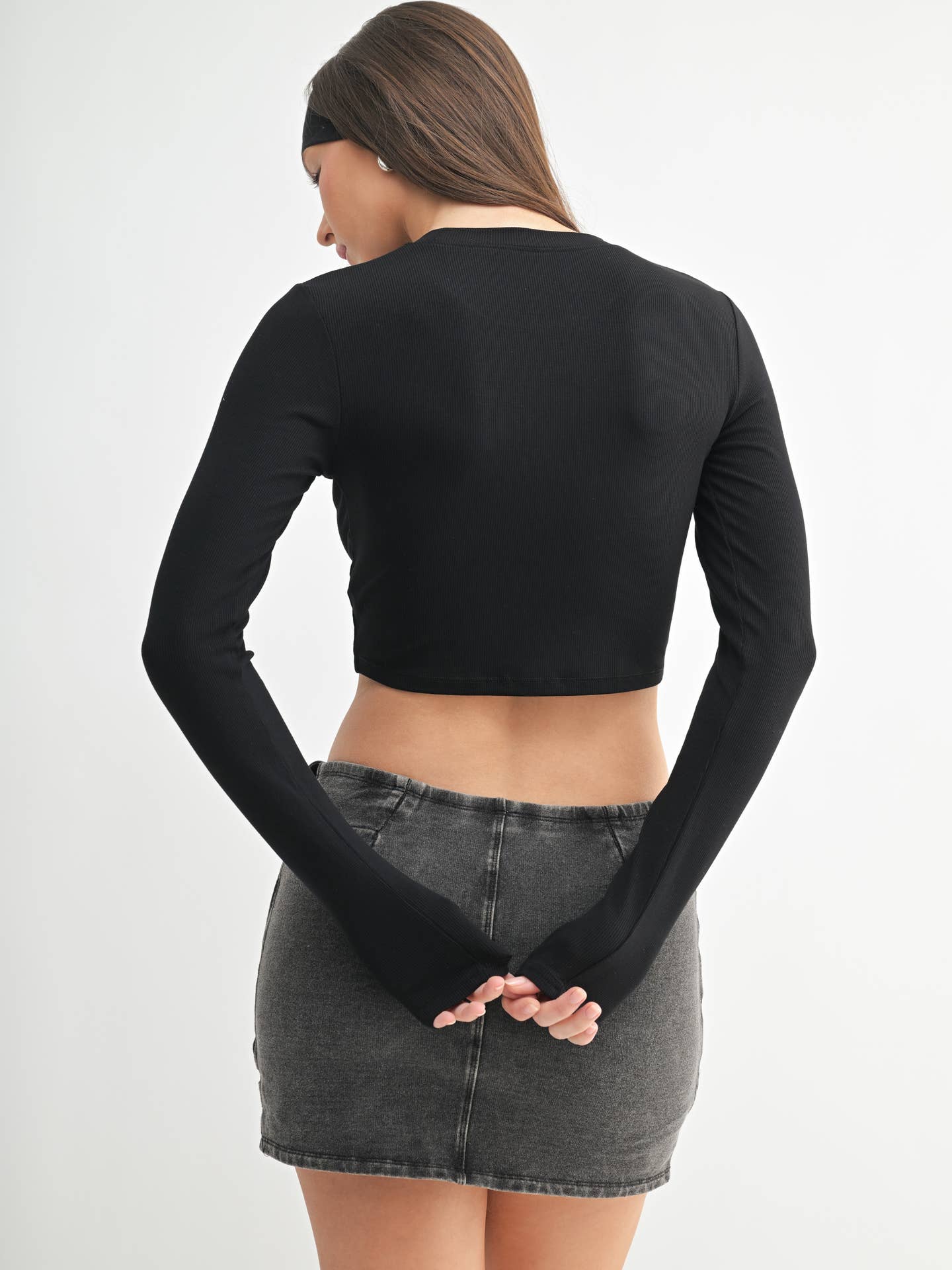 This form-fitting cropped shirt features a rounded neckline and long sleeves, making it perfect to layer over your favorite Mono B sports bra.