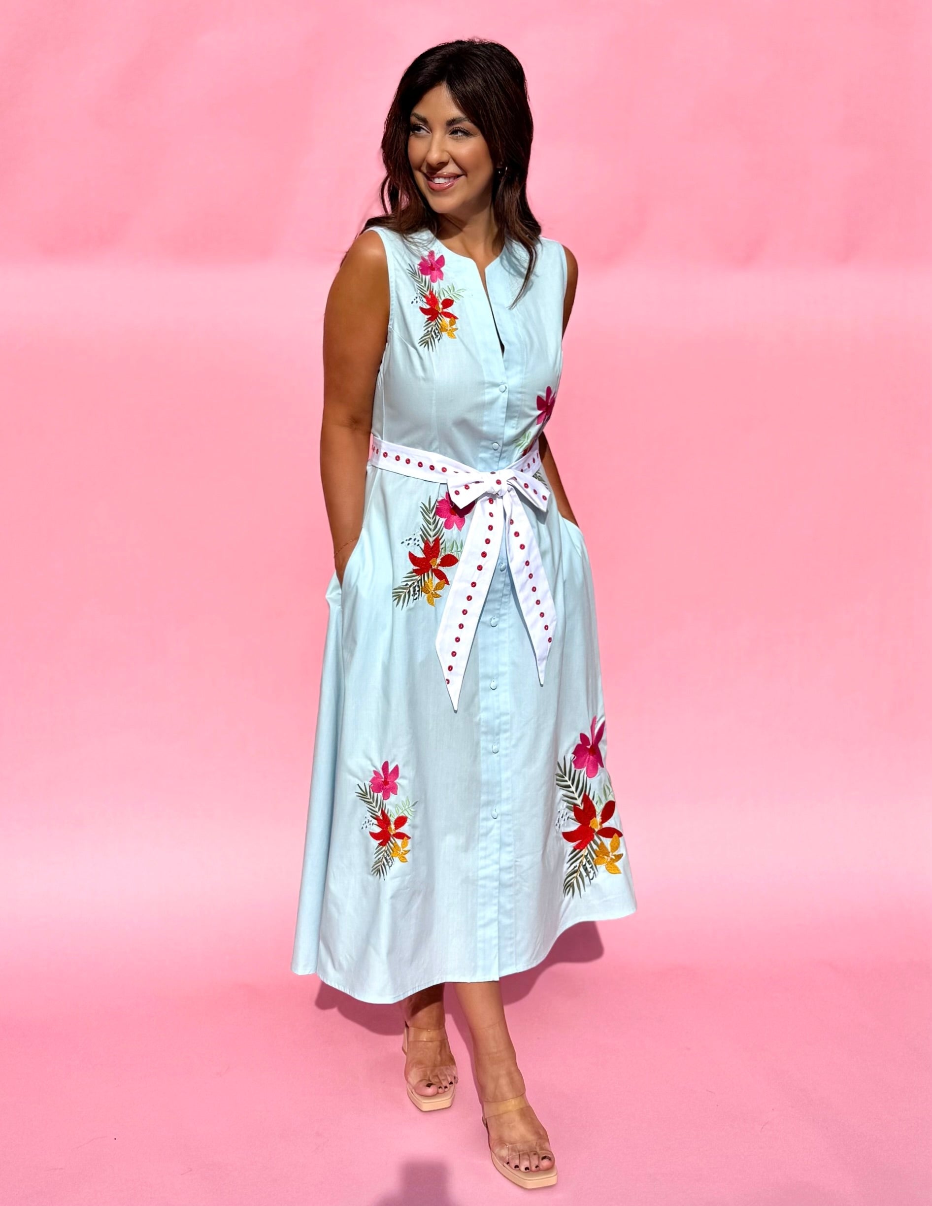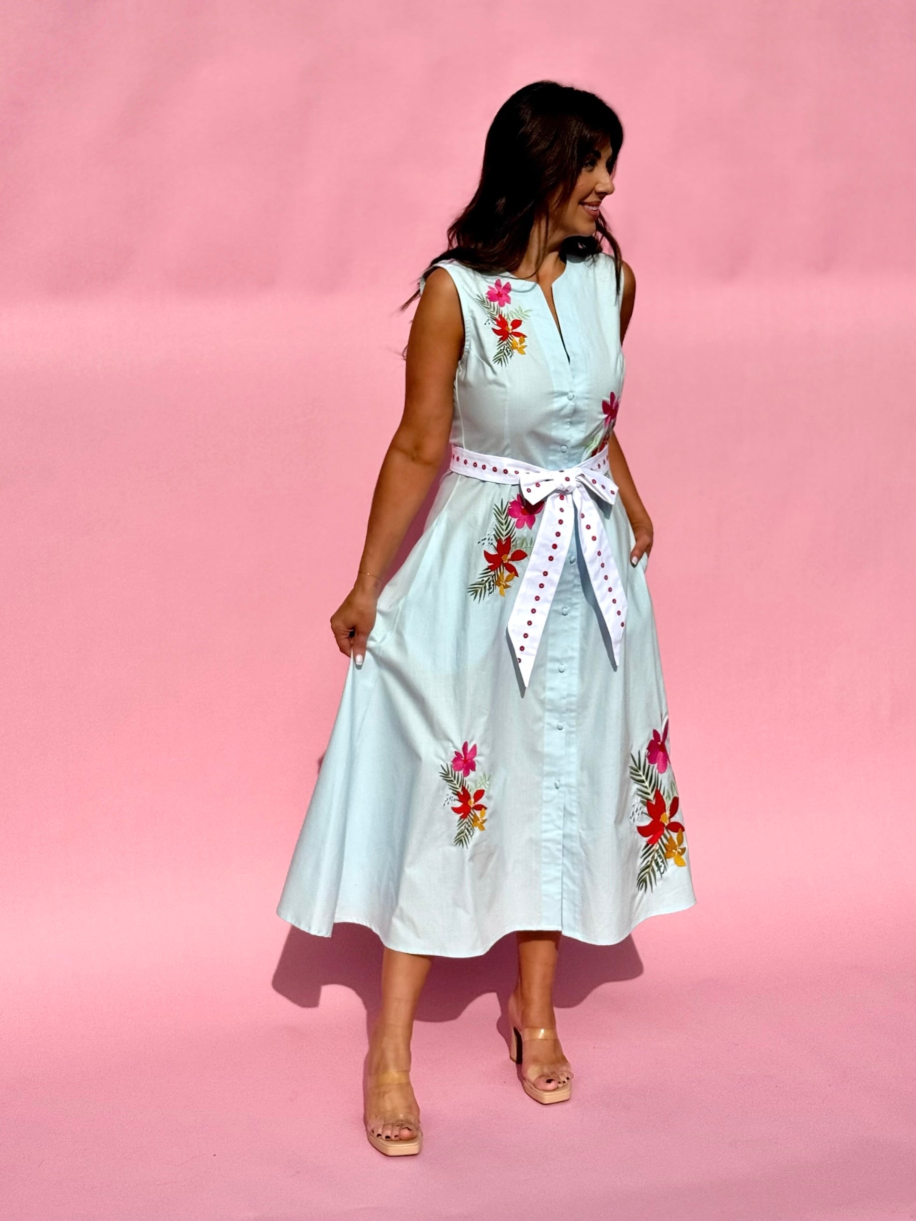 This stunning light blue sleeveless dress blends effortless charm with eye-catching detail. Designed with a flattering button-down front, it features vibrant red embroidery that adds a bold, artisanal touch. A contrasting belt cinches the waist beautifully, creating a feminine silhouette while adding visual interest. Light, airy, and perfect for warm days, this dress transitions seamlessly from casual daytime outings to relaxed evening gatherings. A standout piece that feels both fresh and timeless.