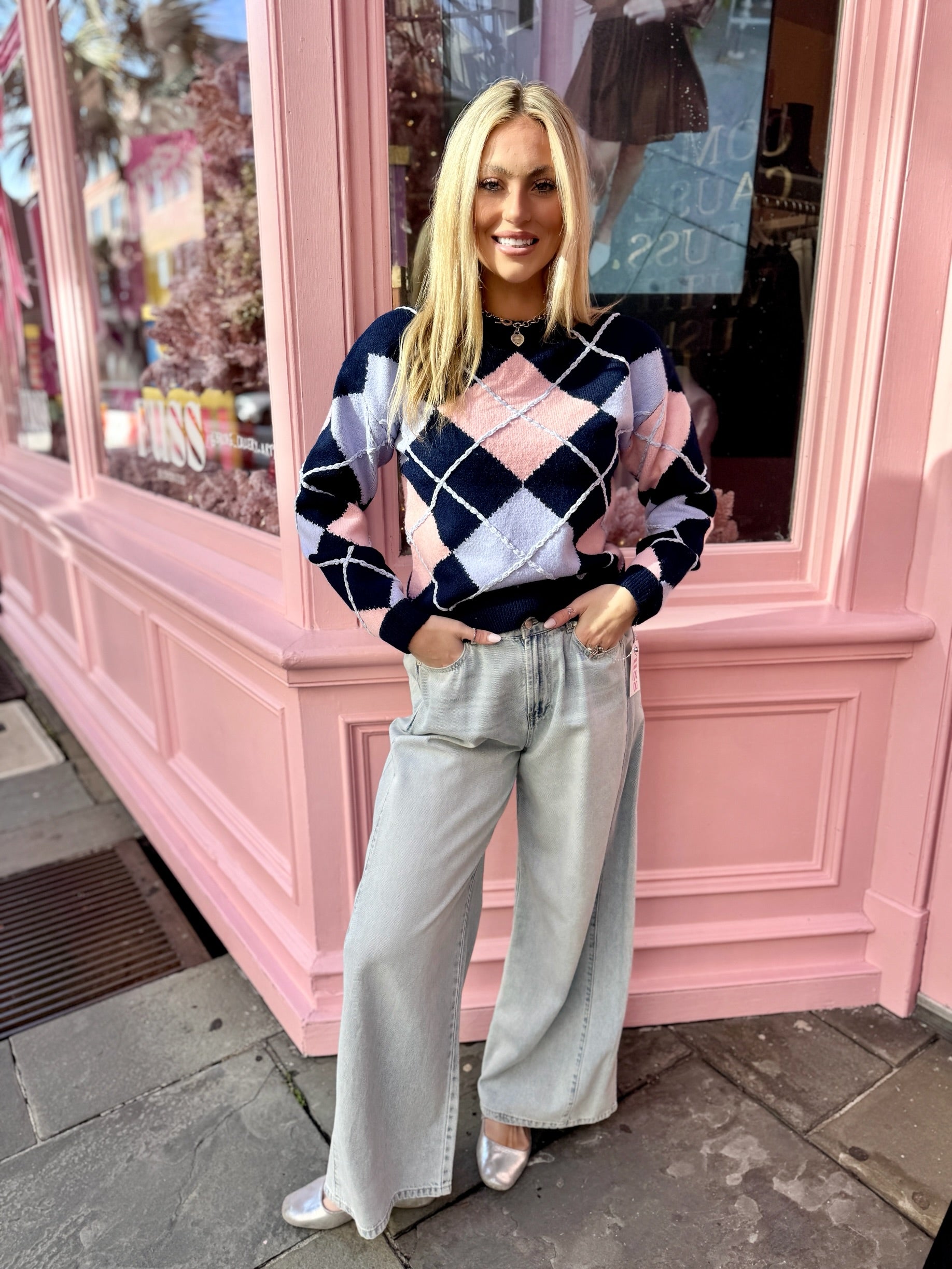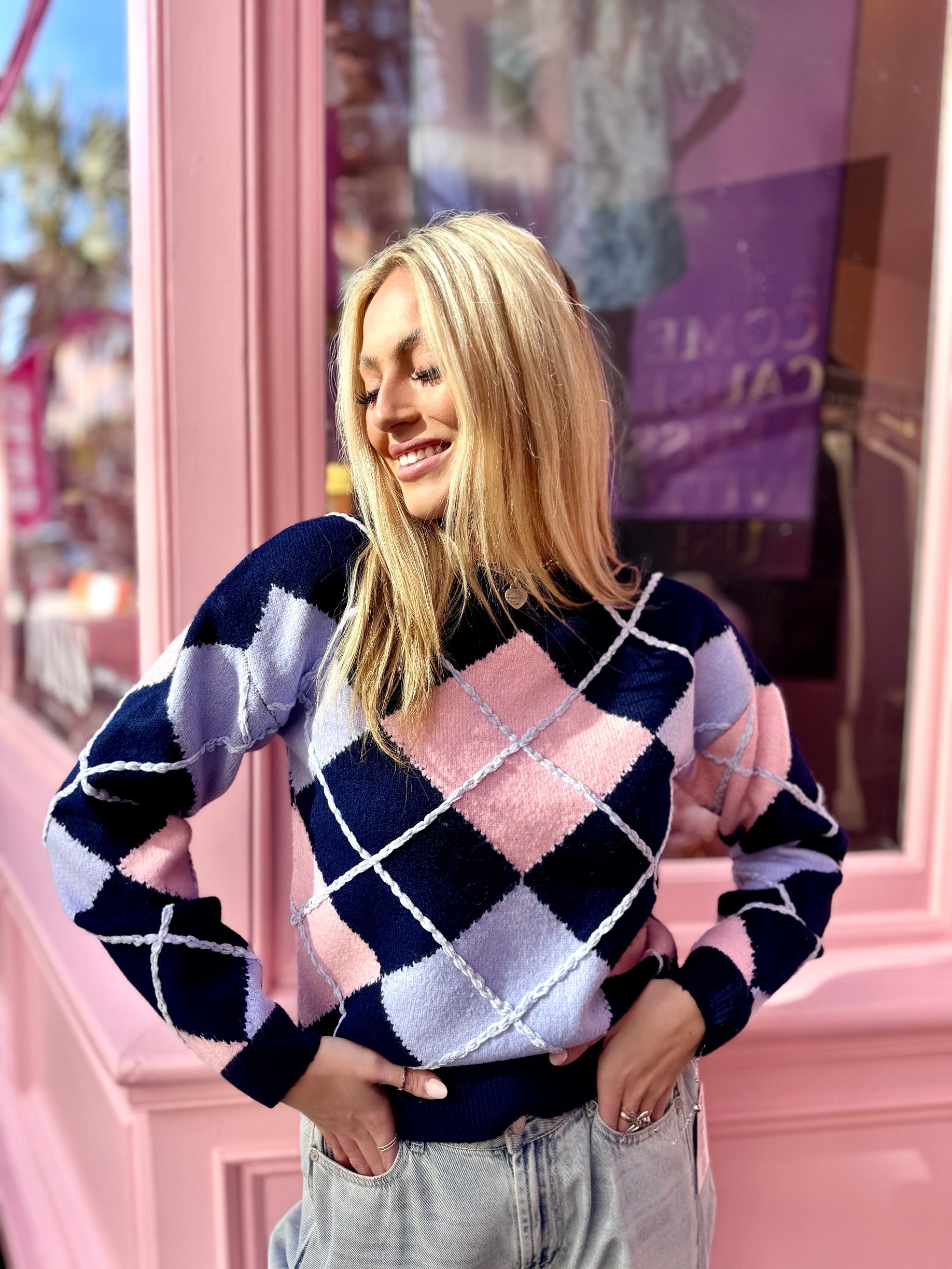 Classic with a colorful twist, this Navy and Pink Argyle Sweater brings timeless charm to your everyday wardrobe. Featuring a traditional argyle pattern in rich navy accented with soft pink tones, it’s crafted from a cozy, comfortable knit that’s perfect for layering. The polished design pairs effortlessly with jeans, trousers, or skirts, making it an easy choice for both casual days and elevated looks.