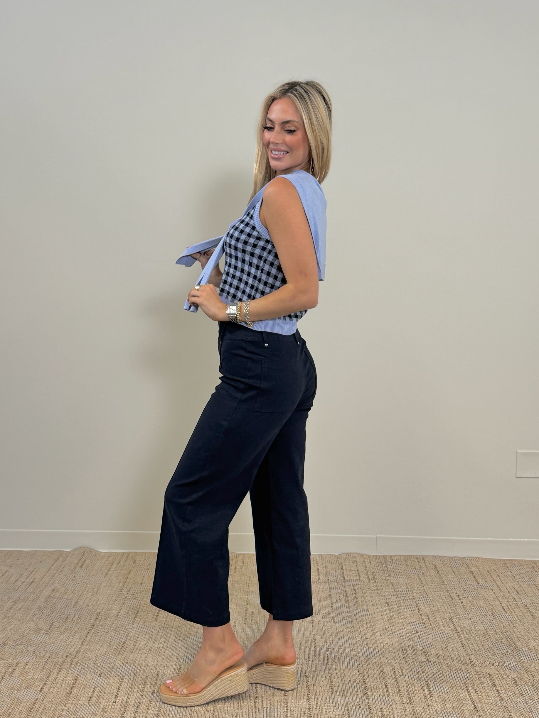 - Sleeveless navy gingham top