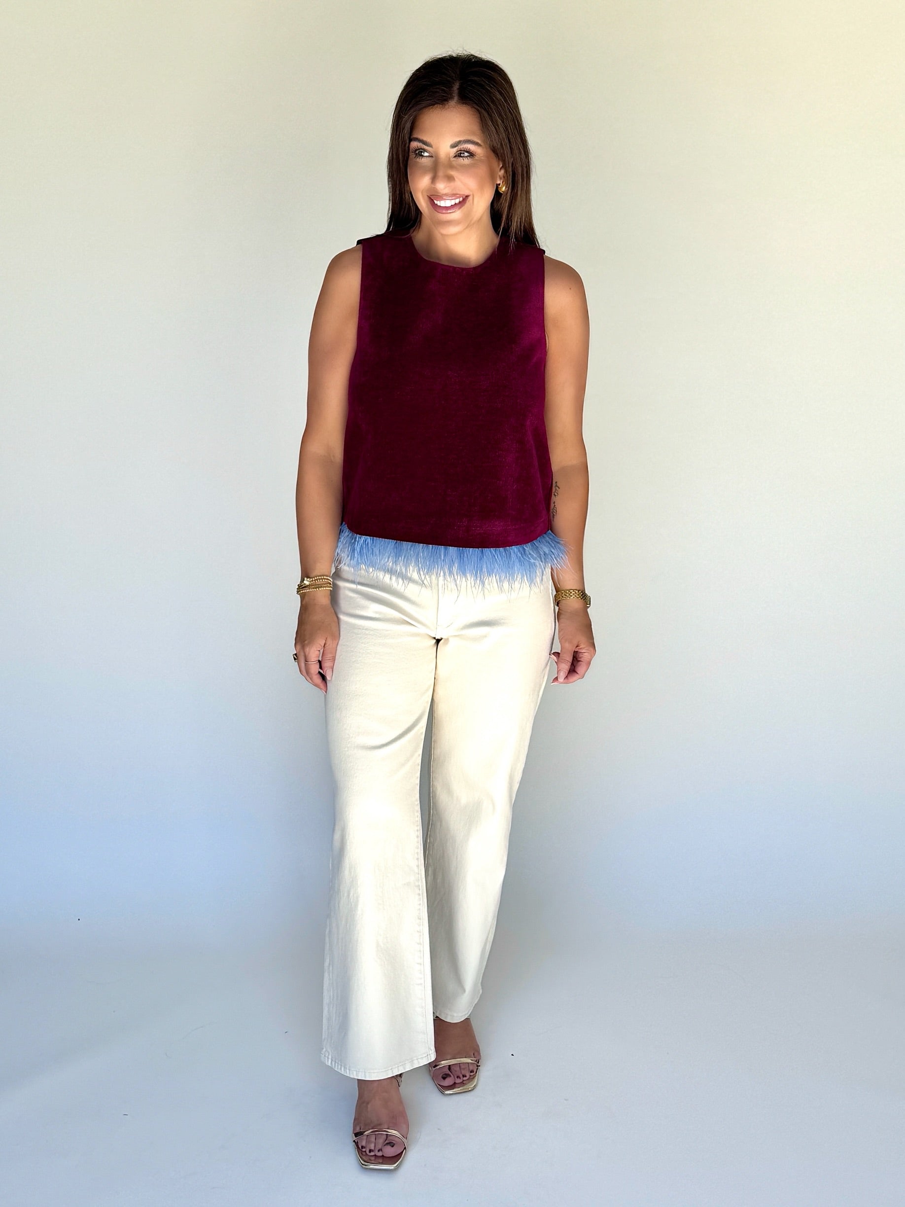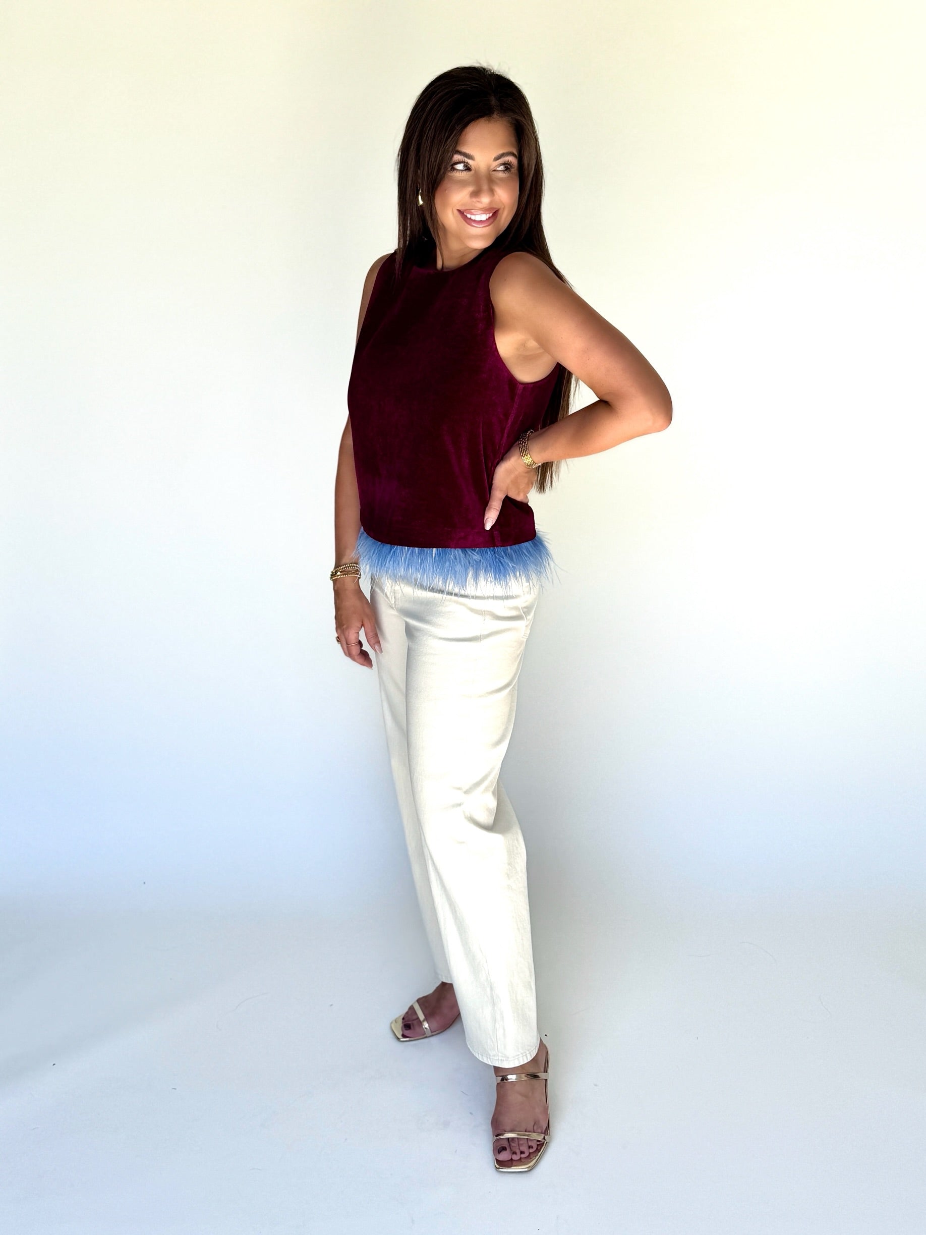 - THML burgundy sleeveless top with periwinkle feather hemline