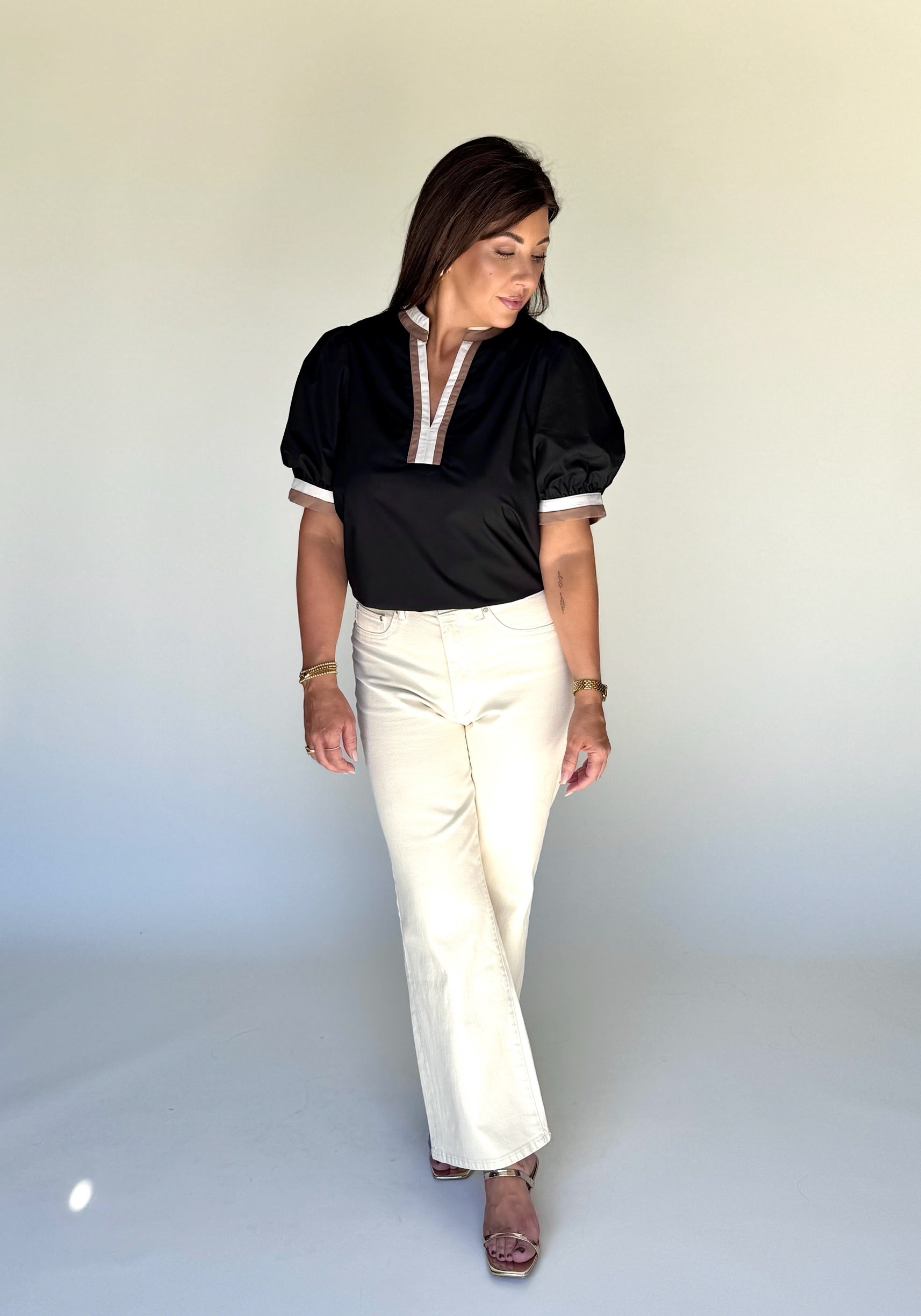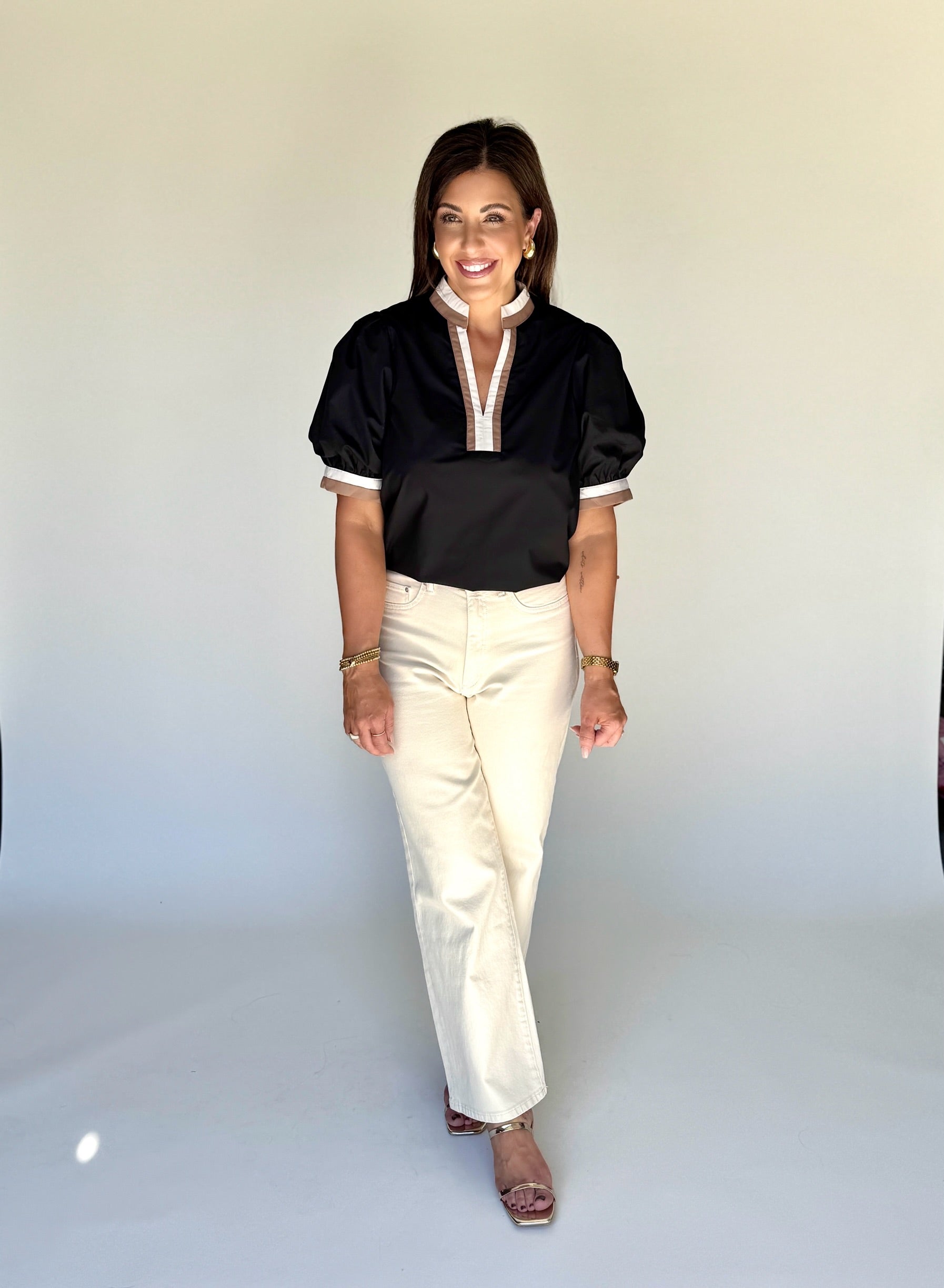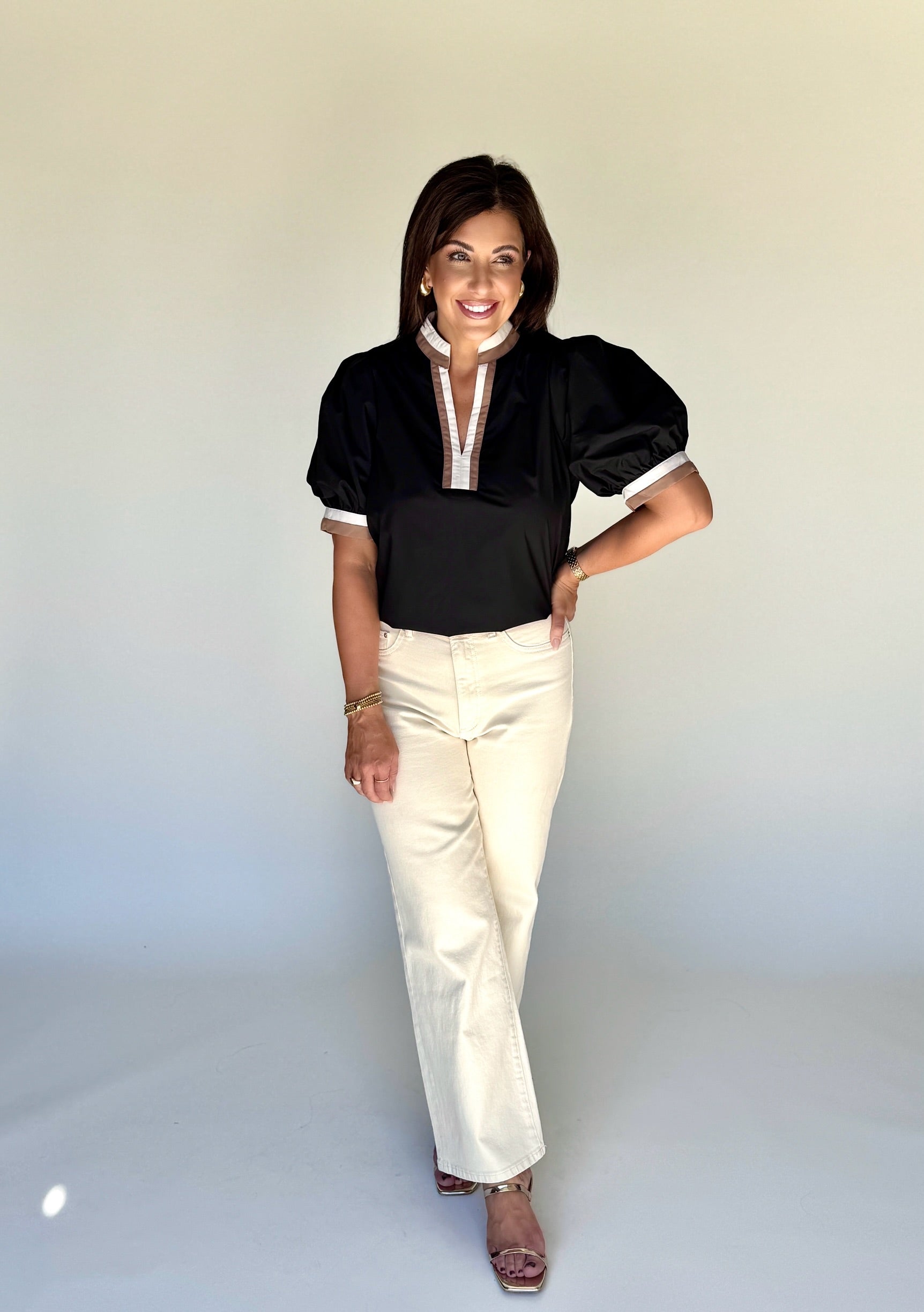 - Solid black short bubble sleeve featuring multicolor band finish.