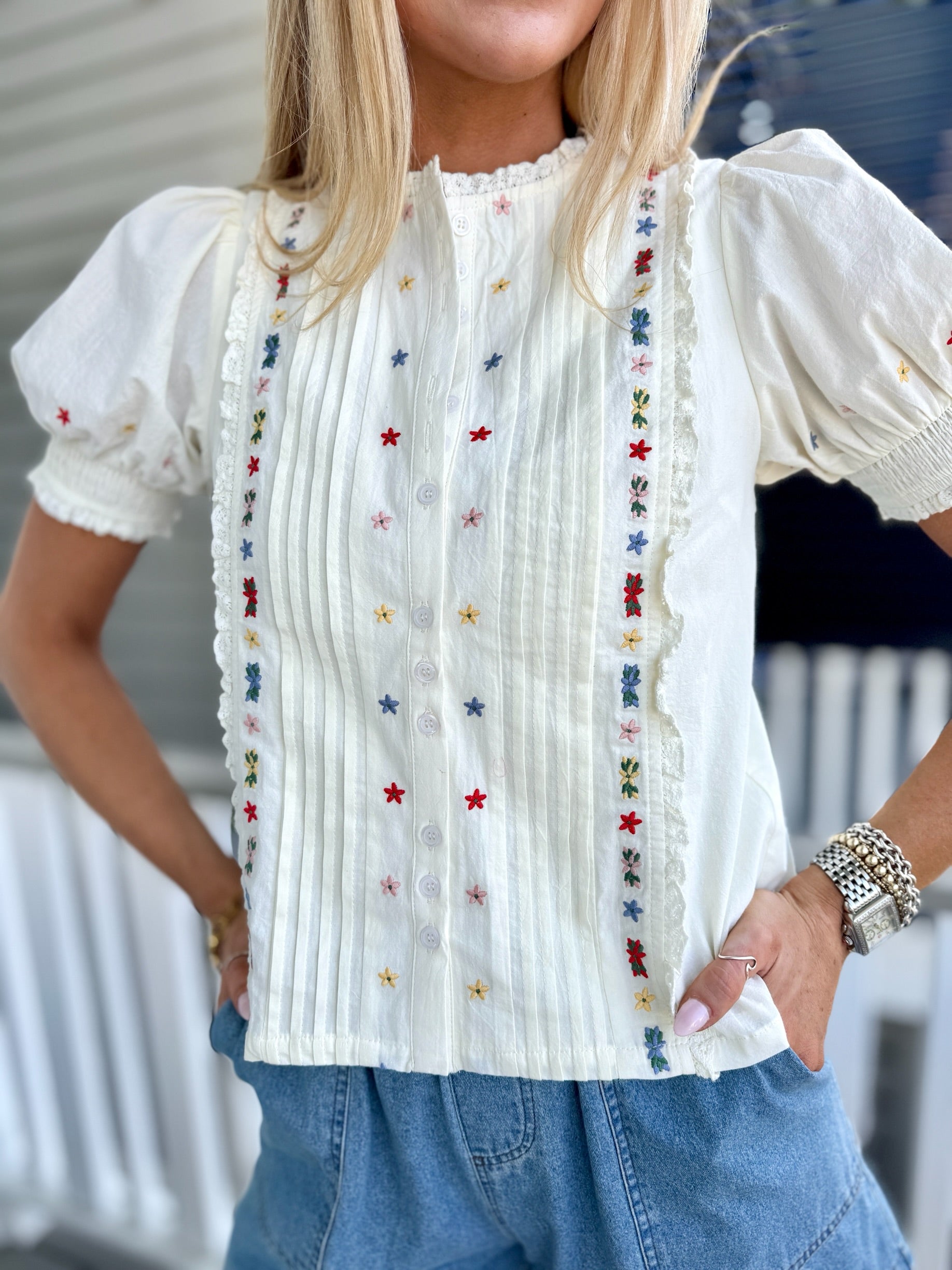 With the Scattered Floral Top. Ya'll know how much we love a beautiful lace moment with vibrant flowers!
