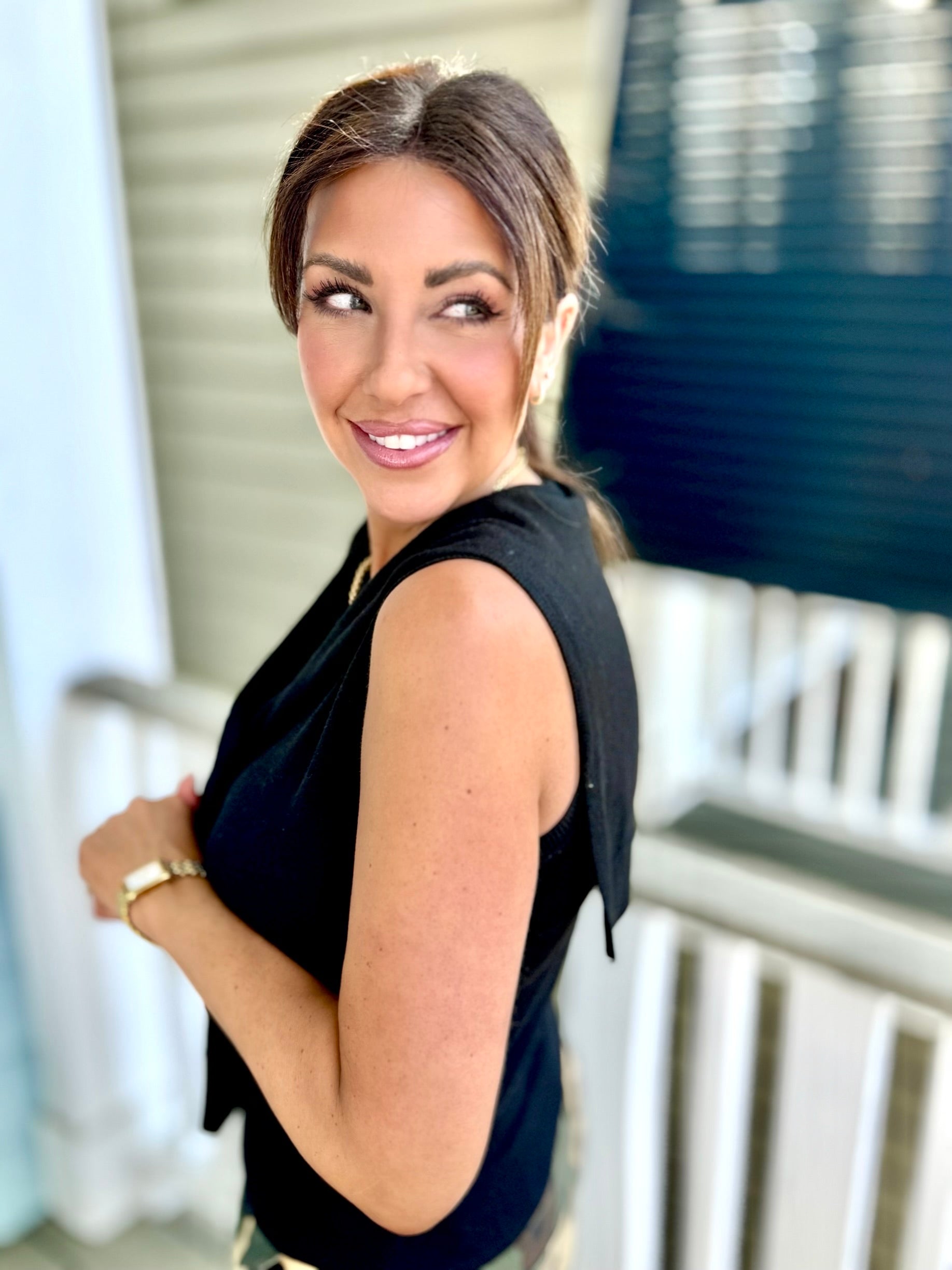 - Solid black sleeveless top