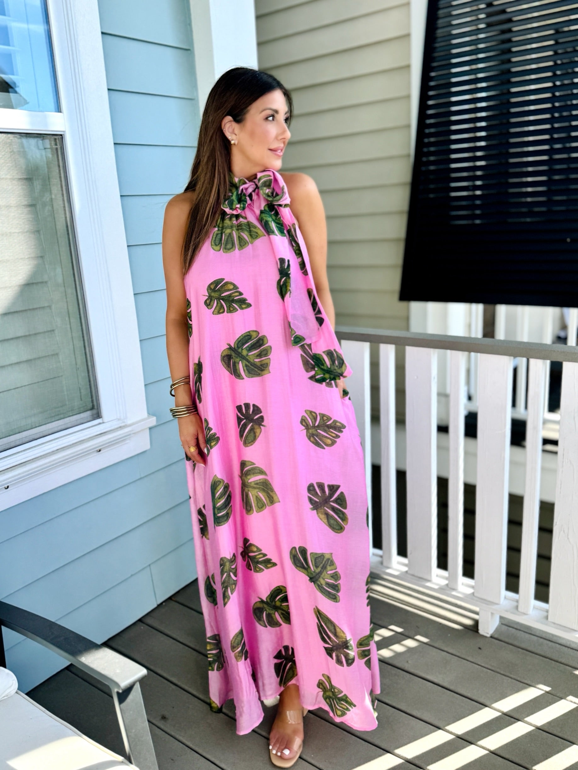- Pink sleeveless halter maxi dress